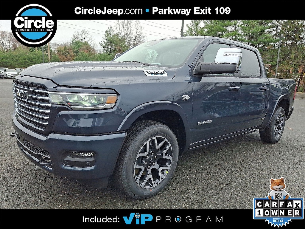 WE ARE OPEN FOR ALL YOUR SALES AND SERVICE NEEDS! COMPLETE ONLINE BUYING EXPERIENCE AVAILABLE! Circle CDJR is proud to offer this terrific 2026 Ram 1500 a positively stunning Truck with the following Features: Laramie Level 2 Equipment Group (14.4" Touchscreen Display, 4G LTE Wi-Fi Hot Spot, Cluster 12" TFT Color Display, Connected Travel and Traffic Services, Connectivity - US/Canada, Front Passenger Interactive Display, GPS Navigation, Harman/Kardon 19 Speaker Premium Sound, Integrated Center Stack Radio, Integrated Voice Command with Bluetooth, Power Tailgate, Radio: Uconnect 5 Nav with 14.4" Display, Rain Sensitive Windshield Wipers, SiriusXM Radio Service, SiriusXM with 360L, and USB Host Flip), Laramie Preferred Package (Accent Color Premium Power Mirrors, Auto Power-Folding Mirrors, Auto-Dimming Exterior Driver Mirror, Black Painted Exterior Mirrors Caps, Body Color Front Bumper, Body Color Rear Bumper with Step Pads, Convex Wide-Angle Exterior Mirror Insert, Dome Dual LED Reading Lamp, Dual-Pane Panoramic Sunroof, Exterior Mirrors Courtesy Lamps, Exterior Mirrors with Heating Element, Exterior Mirrors with Memory, Exterior Mirrors with Supplemental Signals, Grille Surround 3 Body Color Tex 4 Chrome, LED Dome/Reading Lamp, Power Deployable Running Boards, RAM Grille Badge - Chrome, Tow Hooks, and Trailer Brake Control), Quick Order Package 27H Laramie, Towing Technology Group (Trailer Hitch Line-Up Assist), Trailer Tow Group (Trailer Reverse Steering Control and Trailer Tire Pressure Monitoring System), 10 Speakers, 4-Wheel Disc Brakes, ABS brakes, Active Noise Control System, Adjustable pedals, Air Conditioning, Alloy wheels, AM/FM radio: SiriusXM with 360L, Apple CarPlay/Android Auto, Audio memory, Auto High-beam Headlights, Auto-dimming door mirrors, Auto-Dimming Exterior Passenger Mirror, Auto-dimming Rear-View mirror, Automatic temperature control, Brake assist, Bumpers: chrome, Chrome Exterior Mirrors, Chrome Power-Fold Trailer Tow Mirrors, Compass, Delay-off headlights, Driver door bin, Driver vanity mirror, Dual front impact airbags, Dual front side impact airbags, Electronic Stability Control, Forward and Reverse Utility Lights, Front anti-roll bar, Front Bucket Seats, Front Center Armrest w/Storage, Front dual zone A/C, Front fog lights, Front License Plate Bracket, Front reading lights, Front wheel independent suspension, Fully automatic headlights, Garage door transmitter, Heated door mirrors, Heated front seats, Heated rear seats, Heated steering wheel, Illuminated entry, Leather steering wheel, Leather Trimmed Bucket Seats, Low tire pressure warning, Manufacturer's Statement of Origin, Memory seat, Mirror Clearance/Running Lights, MOPAR Front and Rear Rubber Floor Mats, MyFlexCare Service Plan, Navigation System, Occupant sensing airbag, Off-Road Information Pages, Outside temperature display, Overhead airbag, Overhead console, Panic alarm, ParkView Rear Back-Up Camera, Passenger door bin, Passenger vanity mirror, Pedal memory, Power door mirrors, Power driver seat, Power passenger seat, Power steering, Power Telescoping Mirrors, Power windows, Power-Adjustable Convex Aux Mirrors, Radio data system, Radio: Uconnect 5 Navigation with 12.0" Display, Rear anti-roll bar, Rear reading lights, Rear seat center armrest, Rear step bumper, Remote keyless entry, Security system, Speed control, Split folding rear seat, Steering wheel mounted audio controls, Tachometer, Telescoping steering wheel, Tilt steering wheel, Traction control, Trailer Tow Mirrors, Trip computer, Turn signal indicator mirrors, Variably intermittent wipers, Ventilated front seats, Voltmeter, and Wheels: 20" x 9" Premium Paint/Polish. Price includes: $1000 - 2026 National Bonus Cash . Exp. 03/31/2026 $3500 - 2026 National Retail Bonus Cash . Exp. 03/31/2026